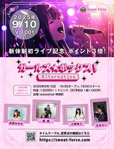| 門西恋主催ライブ15回連続主催ライブ!! 前夜祭(え?つまり16回?w) waiwaihall神保町2025年9月13日(土) 『水急不流月 心外無別法 有志事意成』 〜前夜祭〜 | |