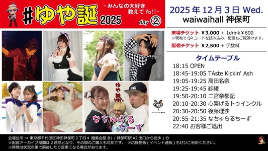 | 出演者 | 神谷美歌/元橋日向/りゅうき/宇陀川歌澄美/時田真実/まねだ康雄/朔〜saku〜/依拾院ももも/雅孔/たまござけ20/心繋げるトゥインクル/暗黒帝國 |